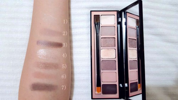 眼影組共7色,包括打底米色、不同深淺的啡色及柔和玫瑰色,顏色百搭實用,可冷可暖,且兼具霧面及閃粉色,妝效可濃郁可清淡,化妝新手基本也不會失手;個人很喜歡這粉棕色調帶來的温柔感。