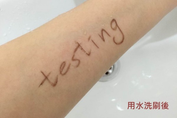 持久度是一支眼線所必須的,基於大家的油眼程度不同,公平起見,我做了些小測試,一試它的持久力。今次我把眼線畫到手背上,共畫了兩次,模擬平日上妝的情況,第一試是試其耐水能力-我把手背直接放到水喉沖刷,一輪洗刷過後,相安無事,清水不行,第二試就加大力度,用卸妝水!我把滲透了卸妝水的化妝棉在筆跡上以正常力度抹了兩次,棉花只沾上少許顏色,最後,我出多少少力,來回抹了八次,筆跡終於完全消失。測試合格,我要帶著這個眼妝去享受周末的陽光了!